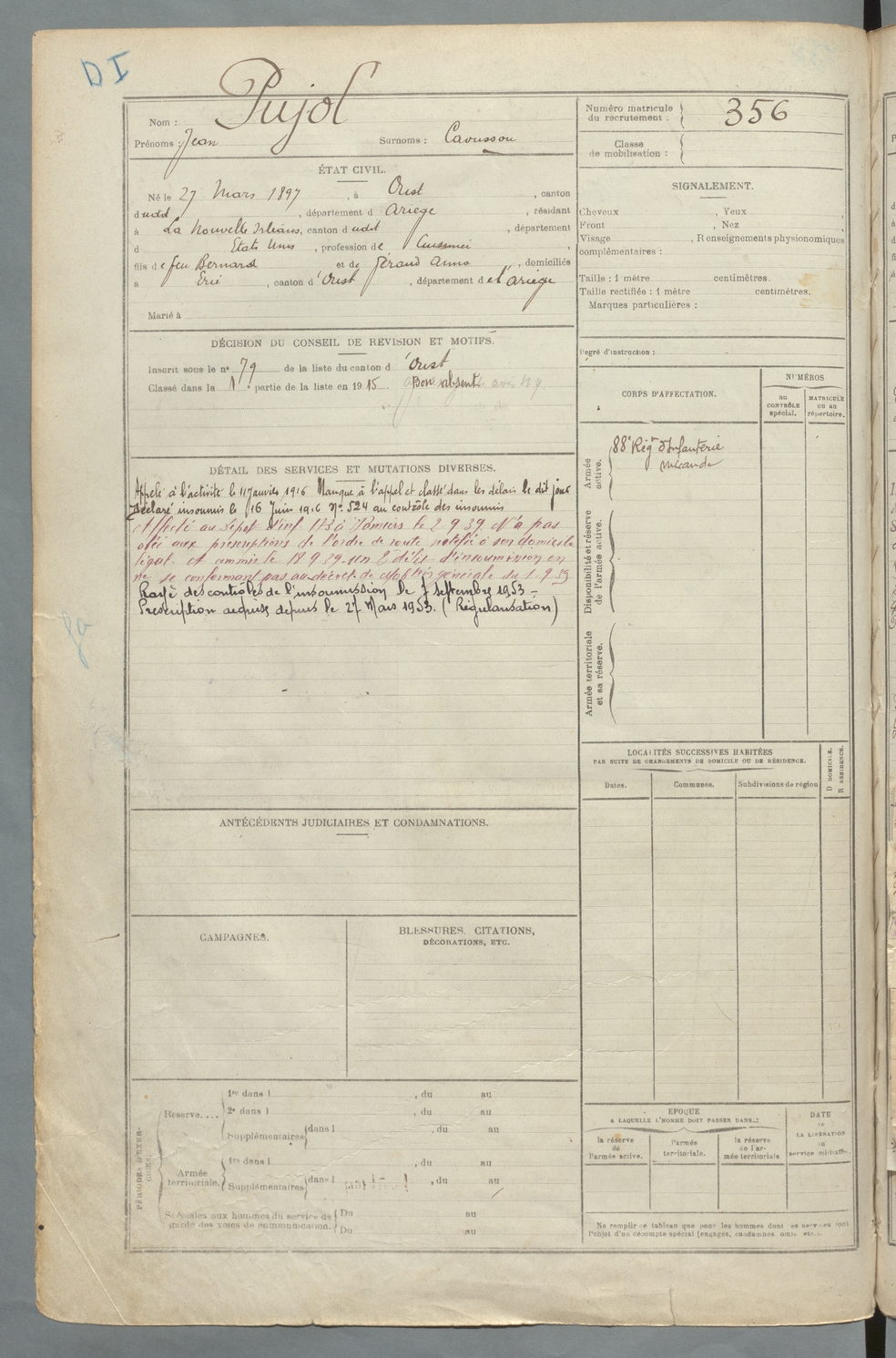 | Pujol | Jean dit Caoussou | FOIX | 129 W 90 | 1917 | Oust | La Nouvelle Orléans | 356 |