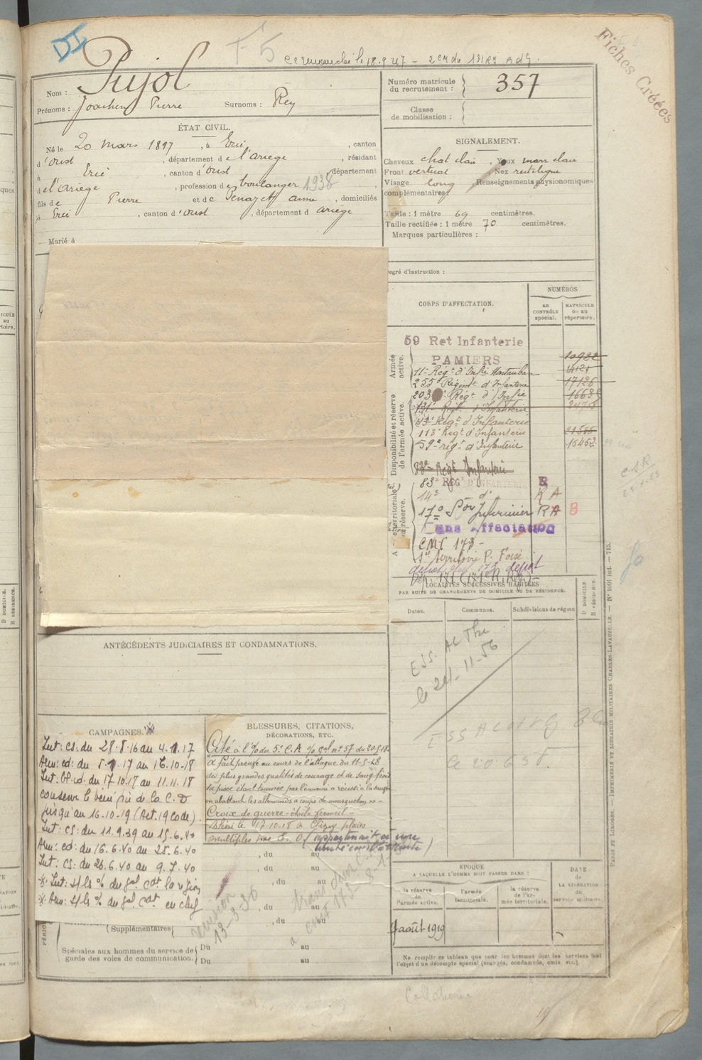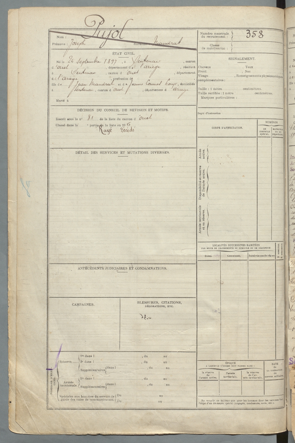 | Pujol | Joseph dit Mondrat | FOIX | 129 W 90 | 1917 | Sentenac-d'Oust | Sentenac-d'Oust | 358 |