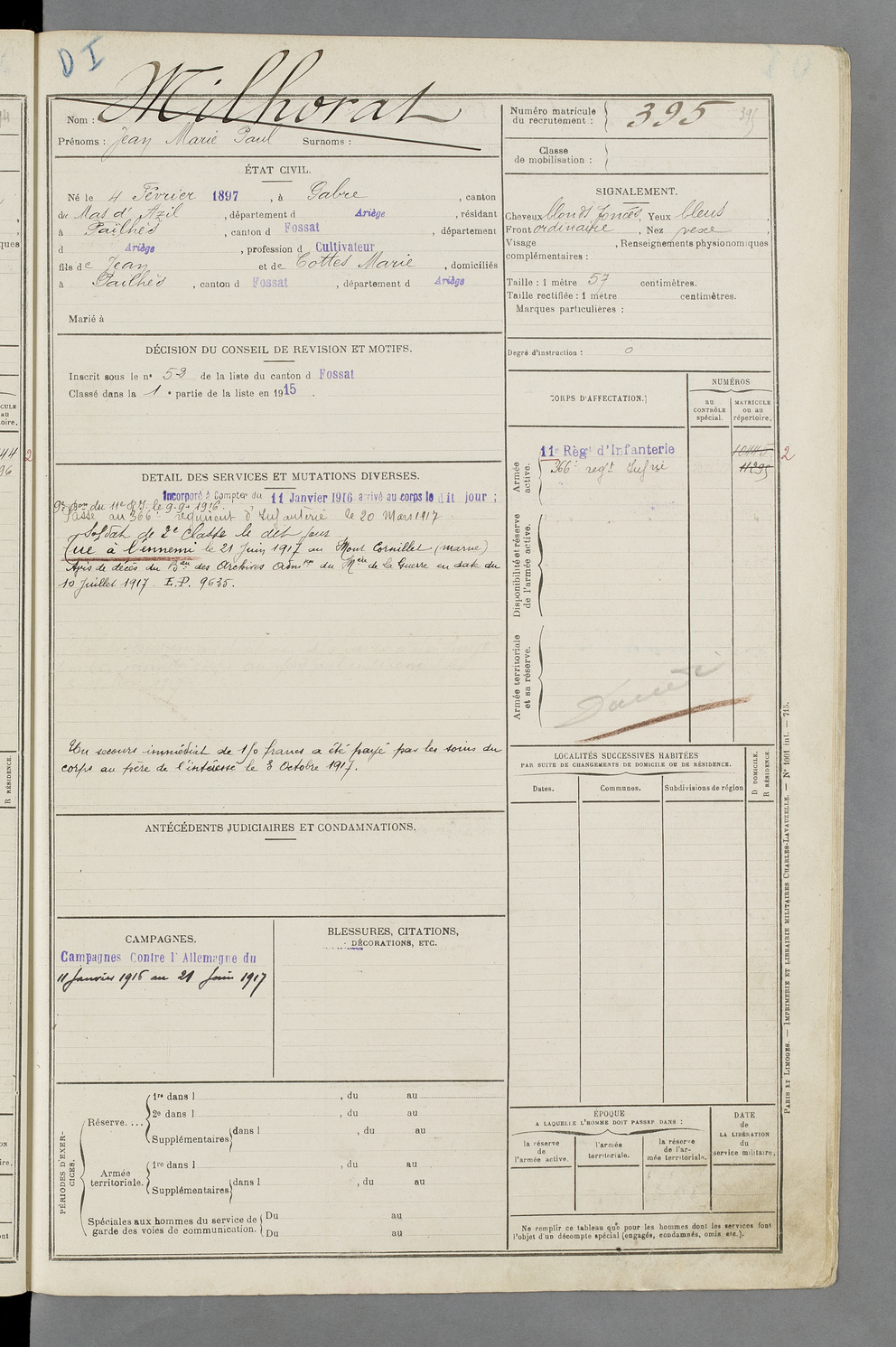 | Milhorat | Jean Marie Paul | FOIX | 129 W 87 | 1917 | Gabre | Pailhès | 395 |
