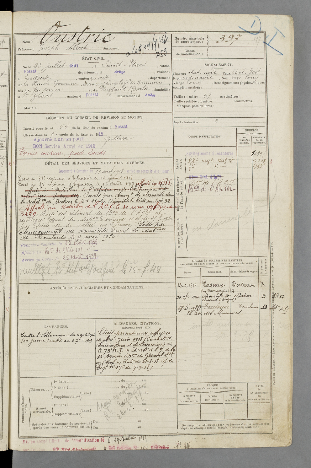 | Oustric | Joseph Albert | FOIX | 129 W 87 | 1917 | Saint-Ybars | Toulouse | 397 |