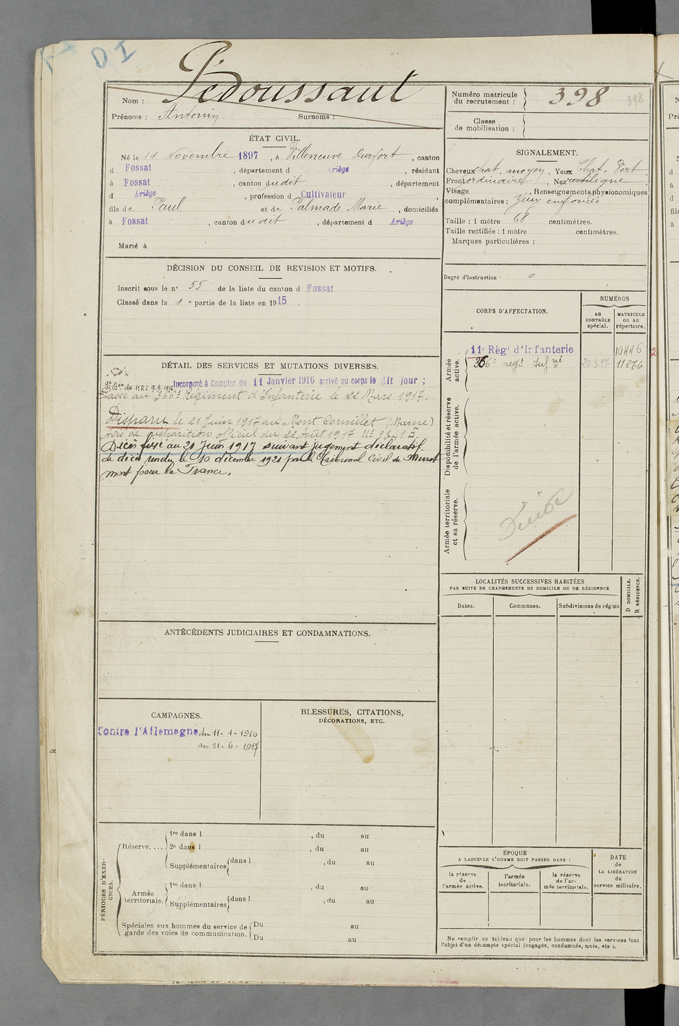 | Pédoussaut | Antonin | FOIX | 129 W 87 | 1917 | Villeneuve Durfort | Fossat | 398 |