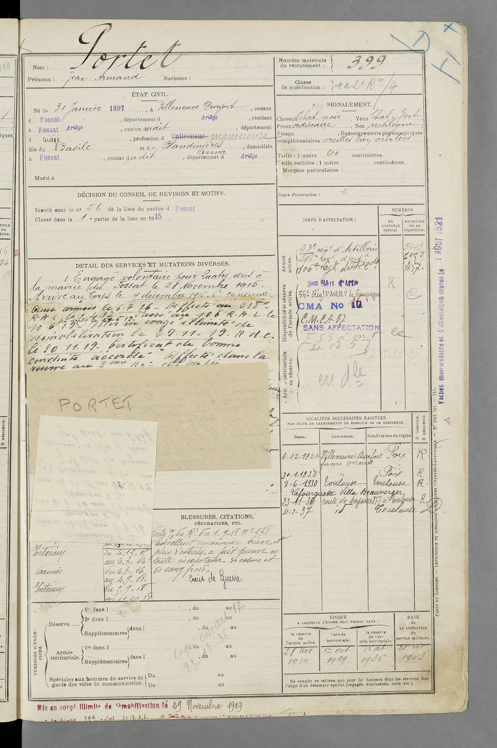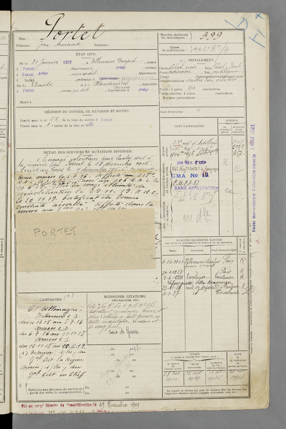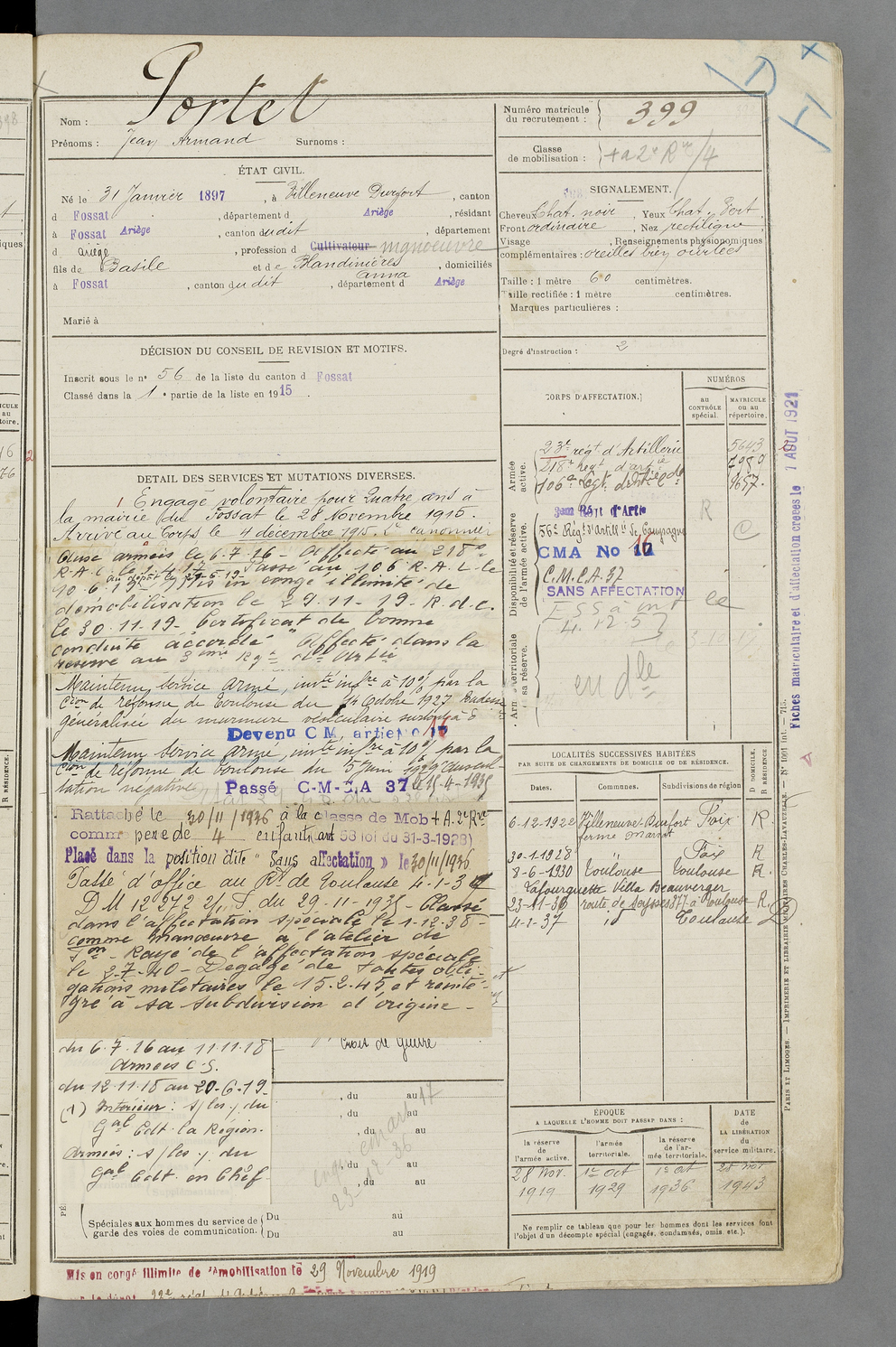 | Portet | Jean Armand | FOIX | 129 W 87 | 1917 | Villeneuve Durfort | Fossat (Le) | 399 |