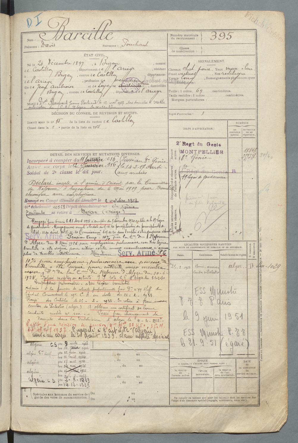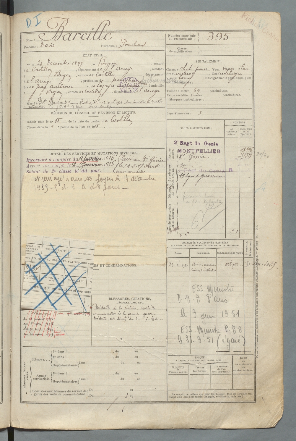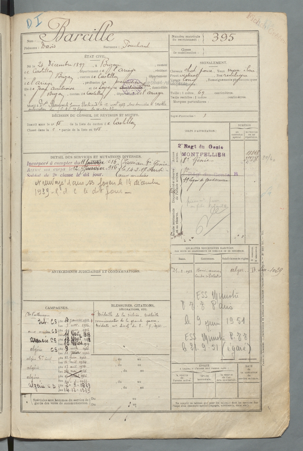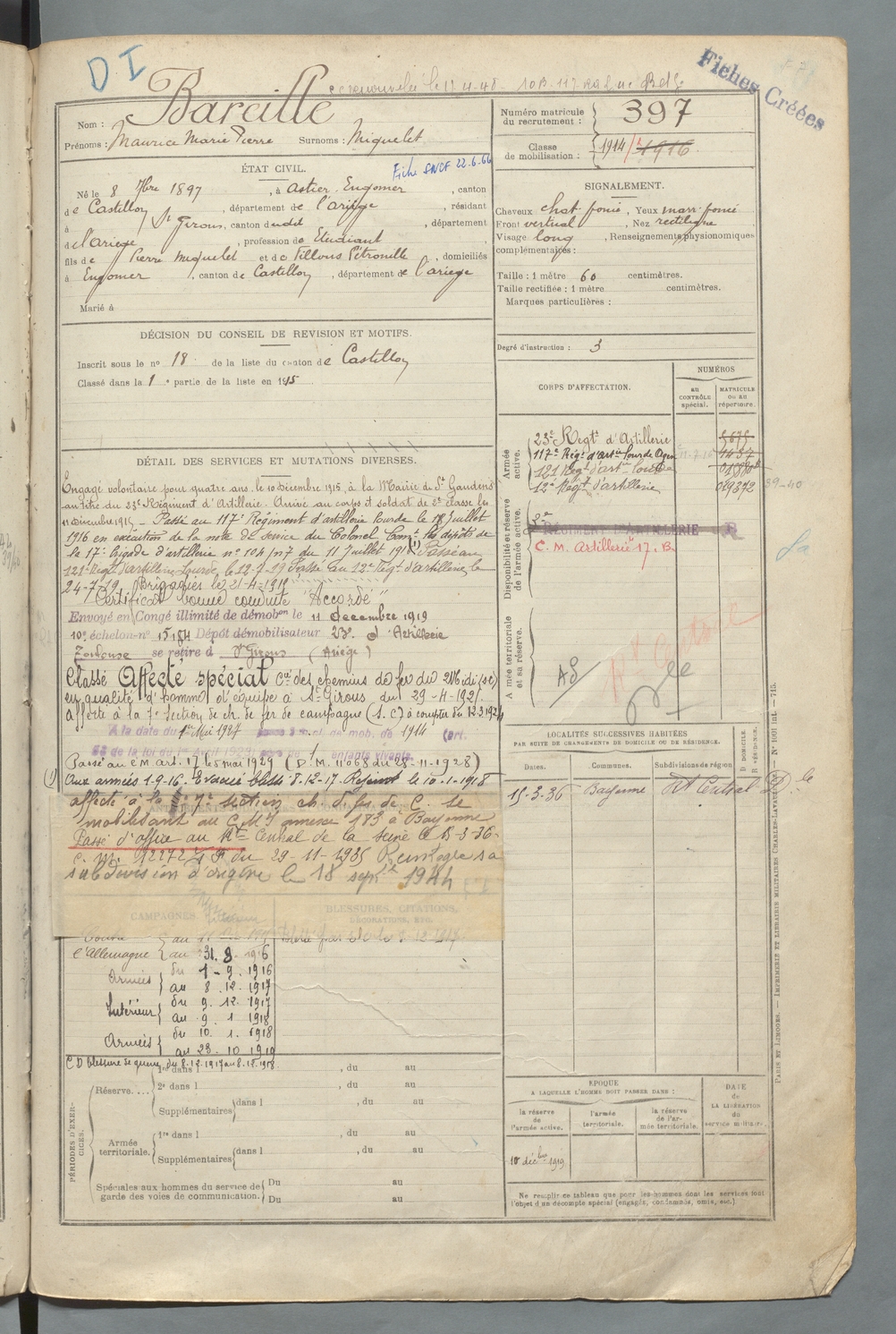 | Bareille | Maurice Marie Pierre dit Miquelet | FOIX | 129 W 90 | 1917 | Engomer | Saint-Girons | 397 |