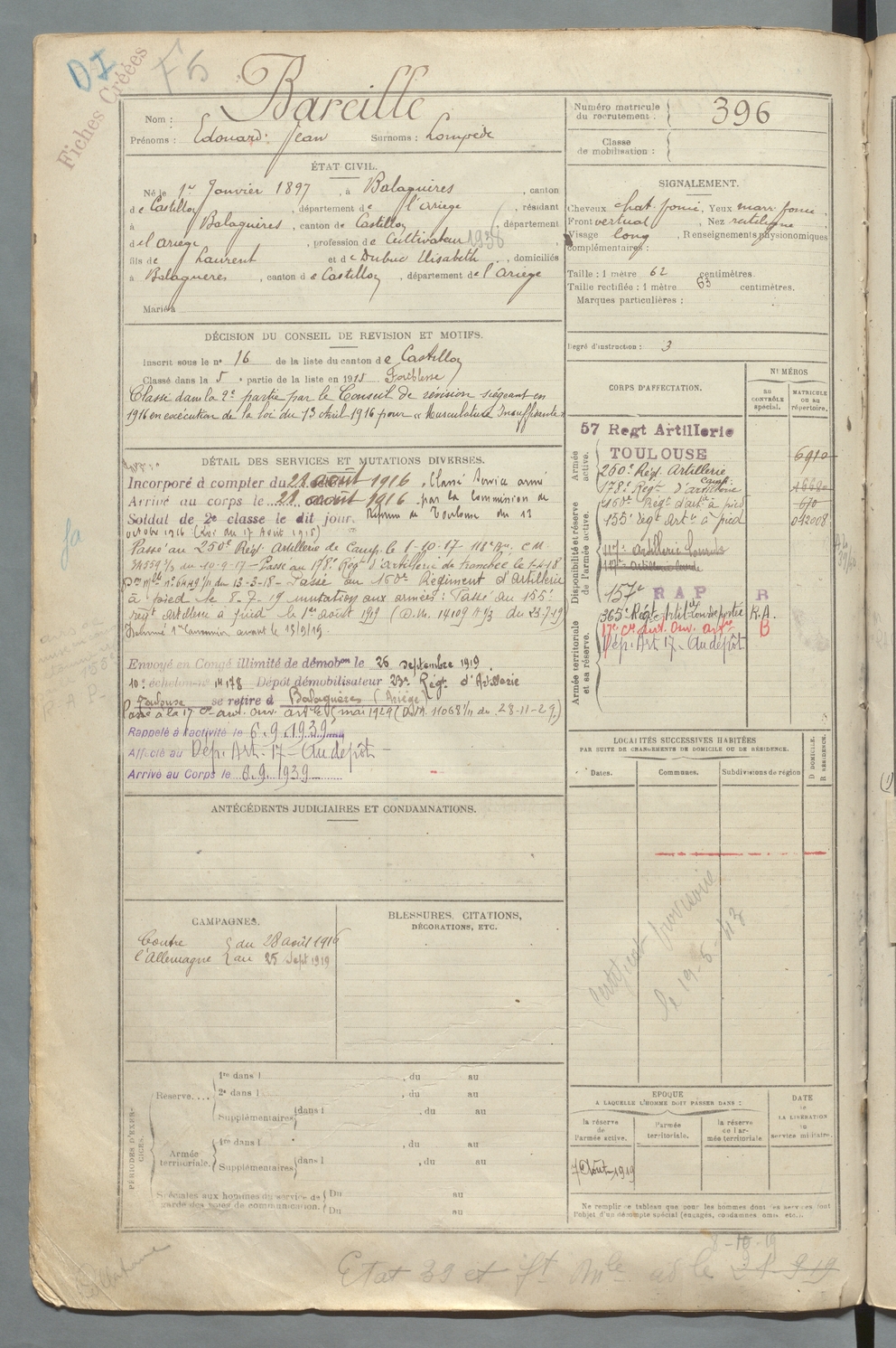 | Bareille | Edouard Jean dit Lompede | FOIX | 129 W 90 | 1917 | Balaguères | Balaguères | 396 |