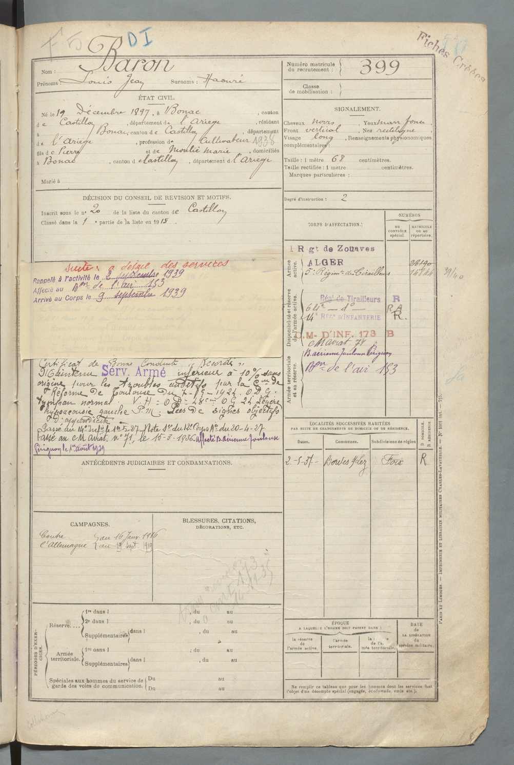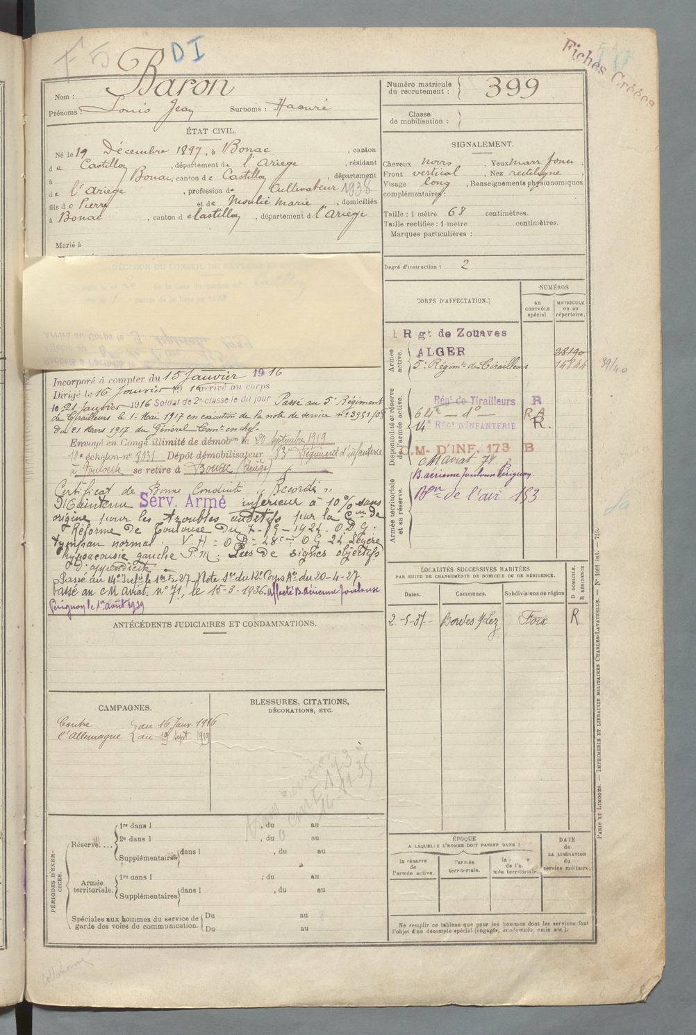 | Baron | Louis Jean dit Haouré | FOIX | 129 W 90 | 1917 | Bonac-sur-Lez | Bonac-sur-Lez | 399 |
