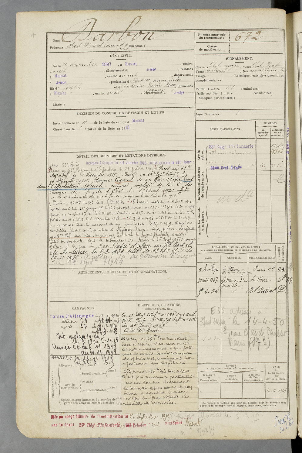 | Darbon | Albert Clément Edmond Jules | FOIX | 129 W 88 | 1917 | Massat | Massat | 672 |