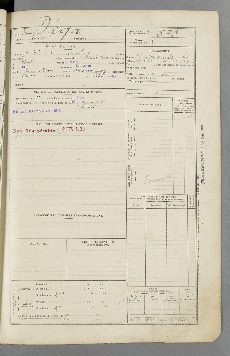 | Déga | François | FOIX | 129 W 88 | 1917 | Toulouse | Biert | 673 |