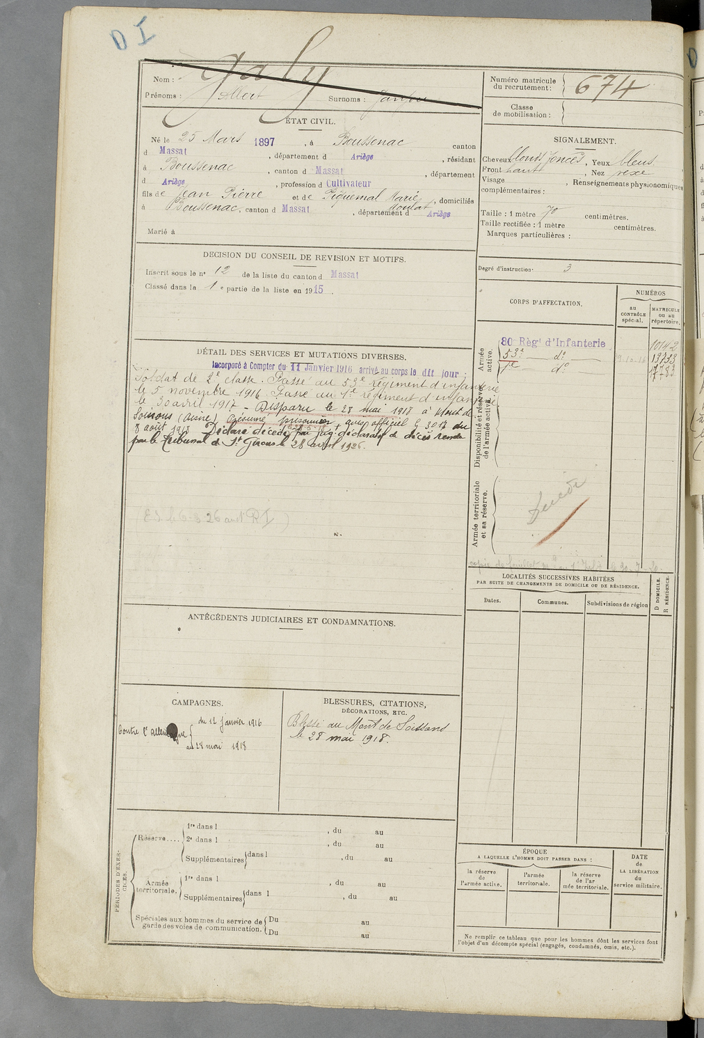 | Galy | Albert dit Janjou | FOIX | 129 W 88 | 1917 | Boussenac | Boussenac | 674 |