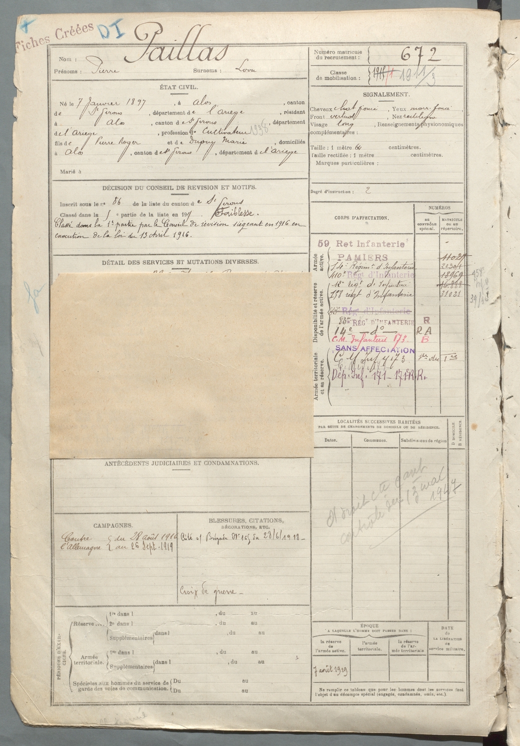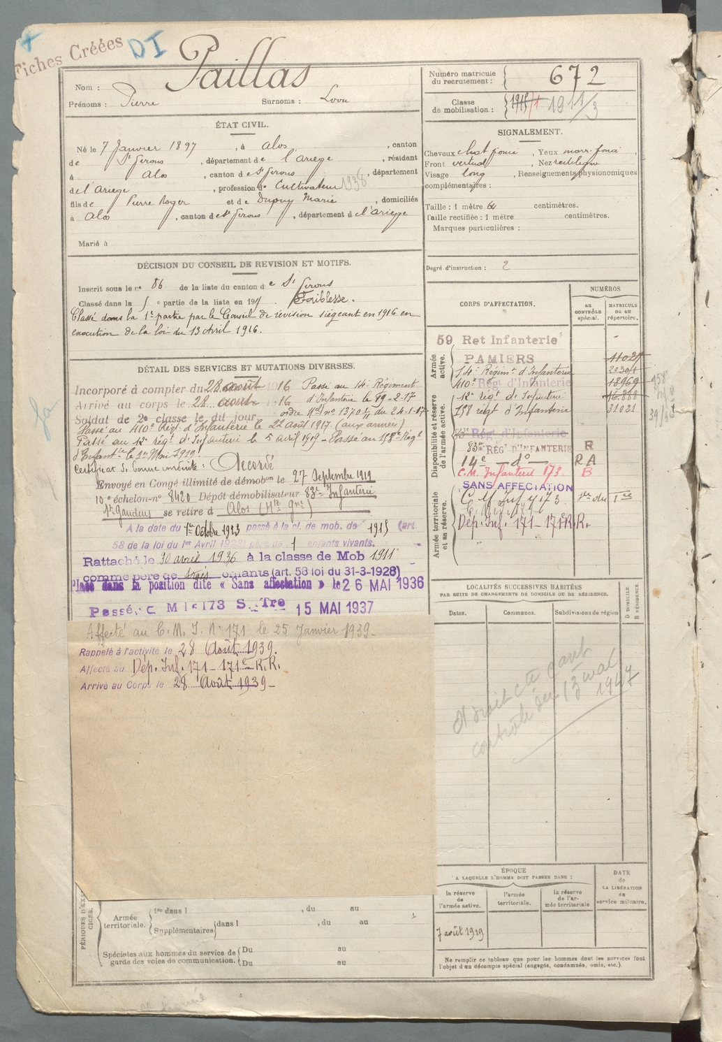 | Paillas | Pierre dit Loon | FOIX | 129 W 90 | 1917 | Alos | Alos | 672 |