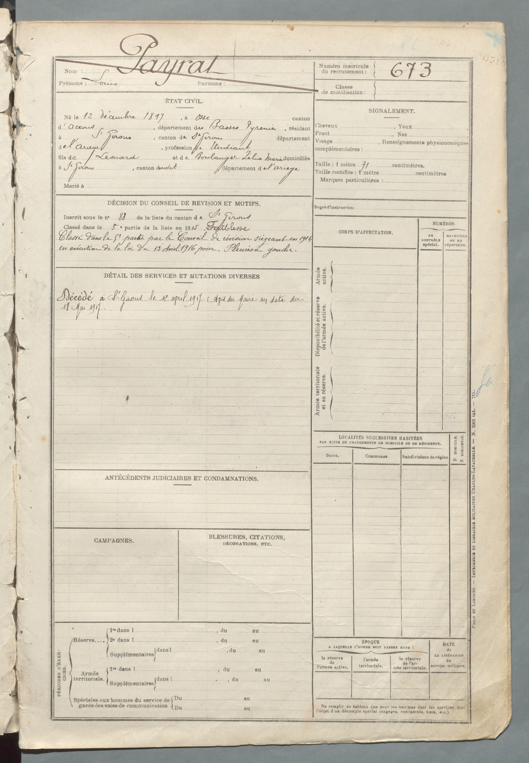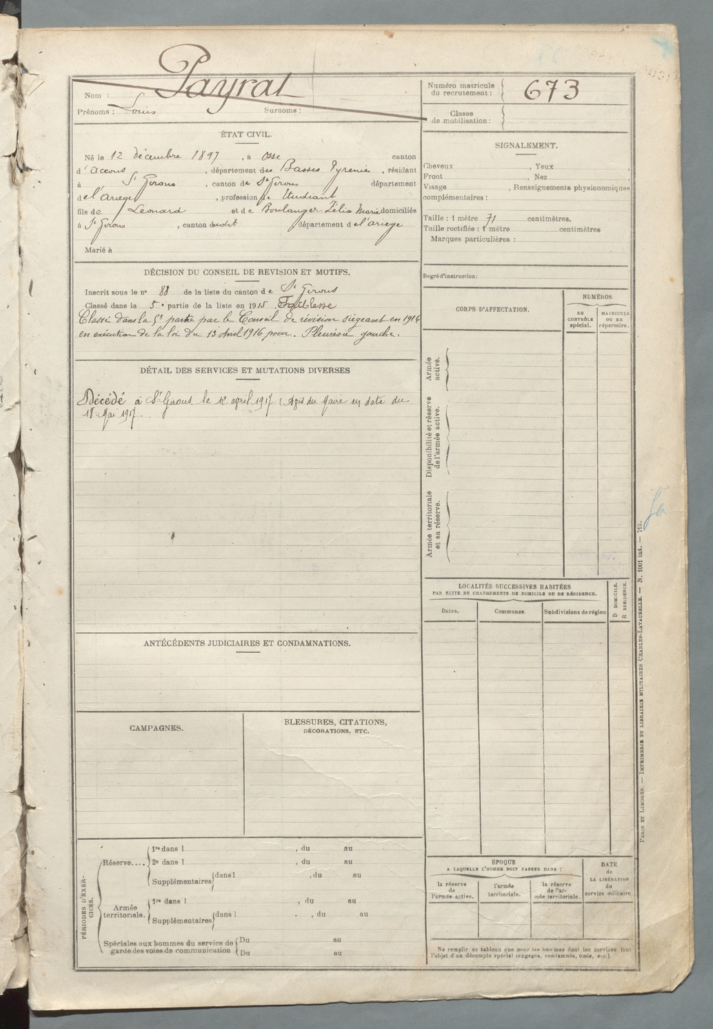 | Payrat | Louis | FOIX | 129 W 90 | 1917 | Osse | Saint-Girons | 673 |